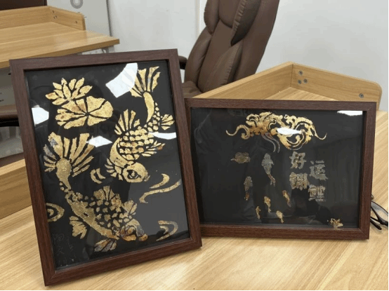 活动中,徐训喆讲解金箔工艺历史,演示从构图、涂胶到 “压、拂、吹” 贴箔的全套技法。同学们专注创作,在交流协作间,锦鲤、云纹等传统图案在深色底板上闪耀金光。